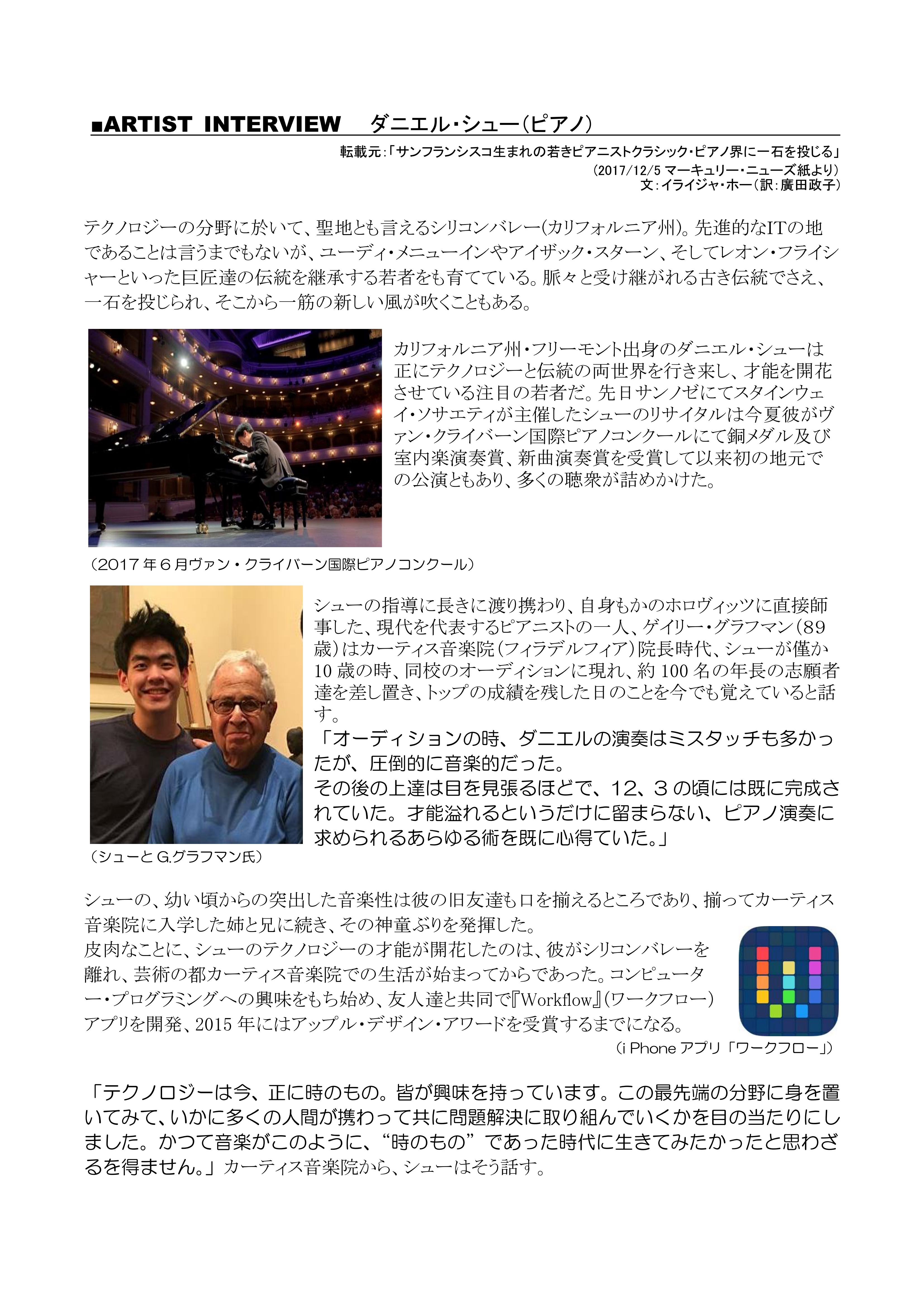 アーティストインタビュー記事紹介 2018-03-29 06:06:00 ツイート アメリカ・カリフォルニア州の新聞、マーキュリーニューズ紙において紹介された、ダニエル・シューのインタビュー記事をご紹介します。